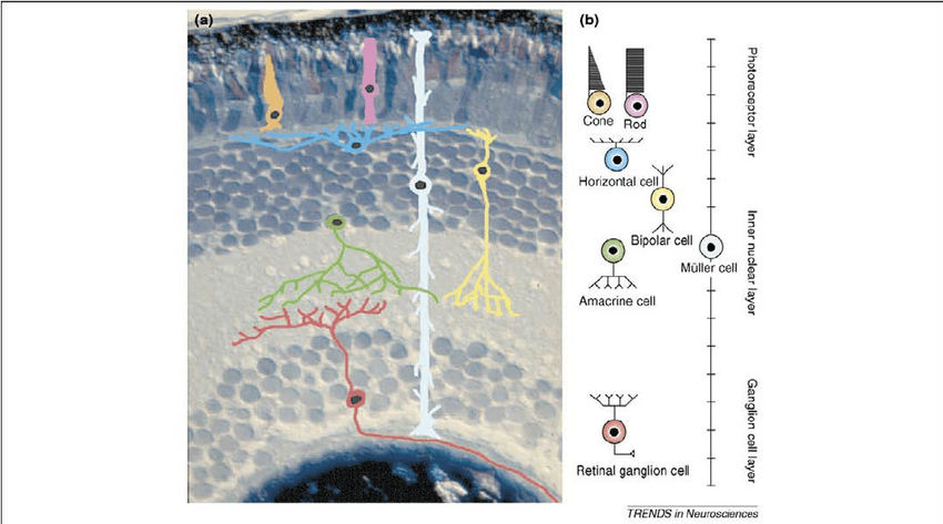 โดยบริเวณเรตินา จะมีเซลล์อยู่ 2 ชนิดคือ cone cell และ rod cell ทำหน้าที่เปลี่ยนแสงเป็นสัญญาณประสาทและส่งไปที่สมอง