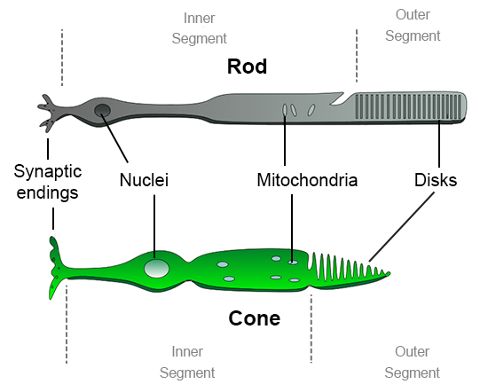 rod cell ทำหน้าที่รับรู้แสง และ cone cell ทำหน้าที่รับรู้สี ซึ่งจะรับรู้สีได้ ต้องมีความสว่างเพียงพอ เราจึงไม่เห็นสีของวัตถุในที่มืดหรือแสงน้อย