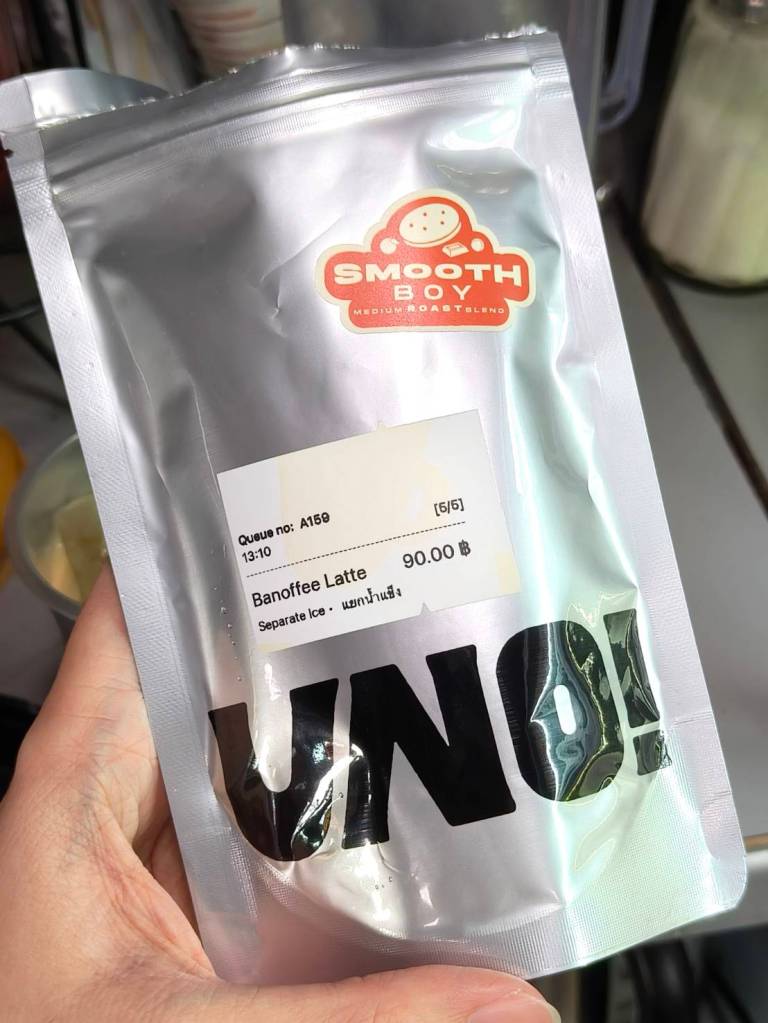 “Banoffee latte” ตัวนี้เป็นกาแฟนม ทางร้านใช้กาแฟคั่วกลาง ที่ให้ชื่อว่า “Smooth boy” สู้กับนมกลิ่นกล้วยได้เป็นอย่างดี รสเนียน หวานกลางๆ หอมกล้วย กินเพลินๆ