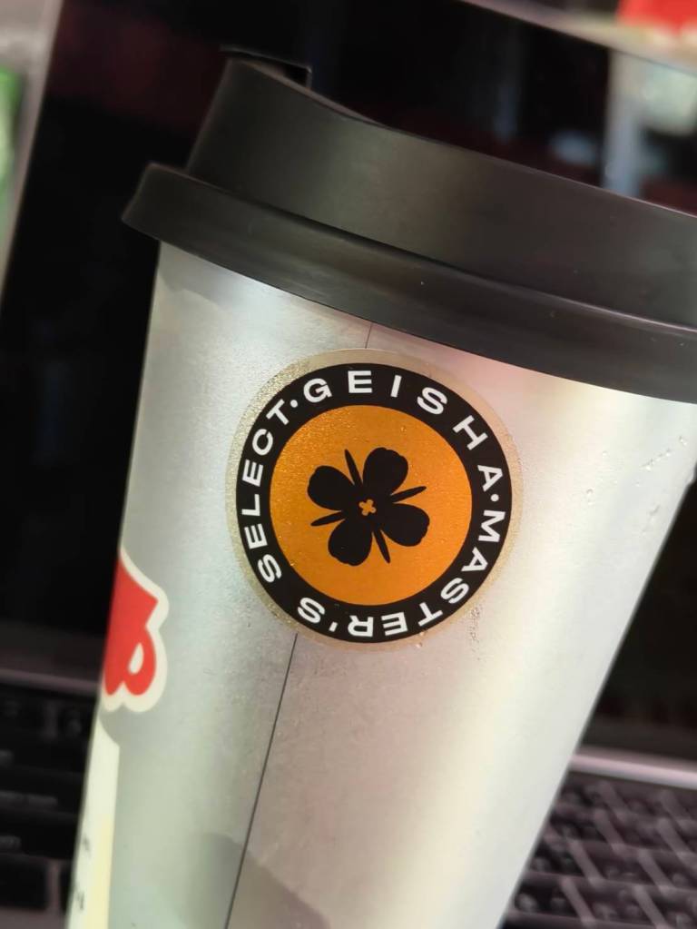 ใครที่เห็นแก้วจากทางร้านแล้ว สงสัยว่าเป็นแก้วอลูมิเนียม รึเปล่า ไม่ใช่นะครับเป็นแก้วพลาสติก สีเงินด้าน สกรีนโลโก้ร้านลงไปบนเนื้อแก้วเลย และแก้วเกอิชา จะมีแปะสติ๊กเกอร์กันน้ำลงไปด้วย